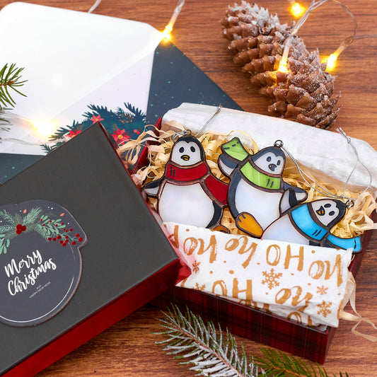 Ready-to-Give Christmas Gift in Festive Box: Set of 3 Penguin Stained Glass Ornaments