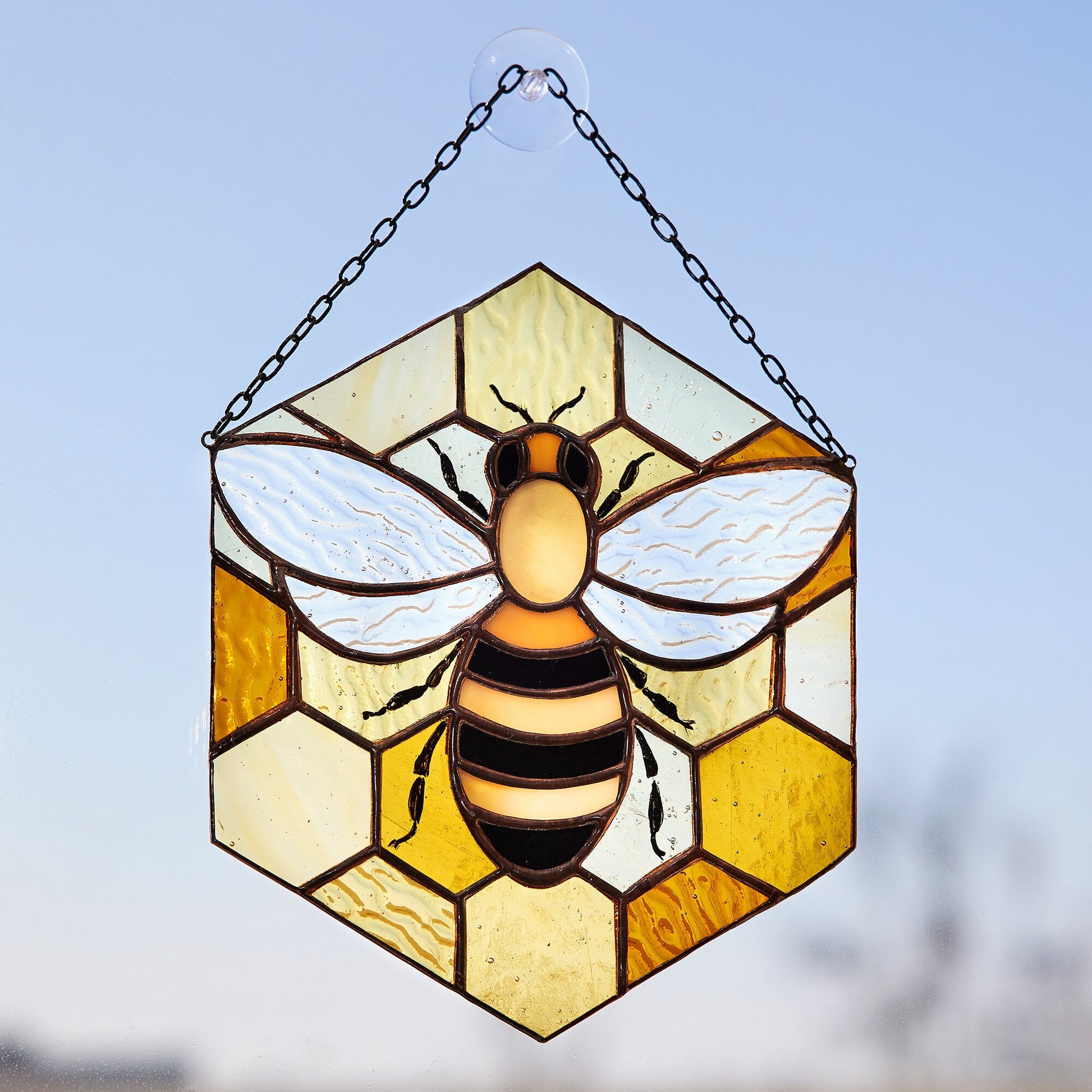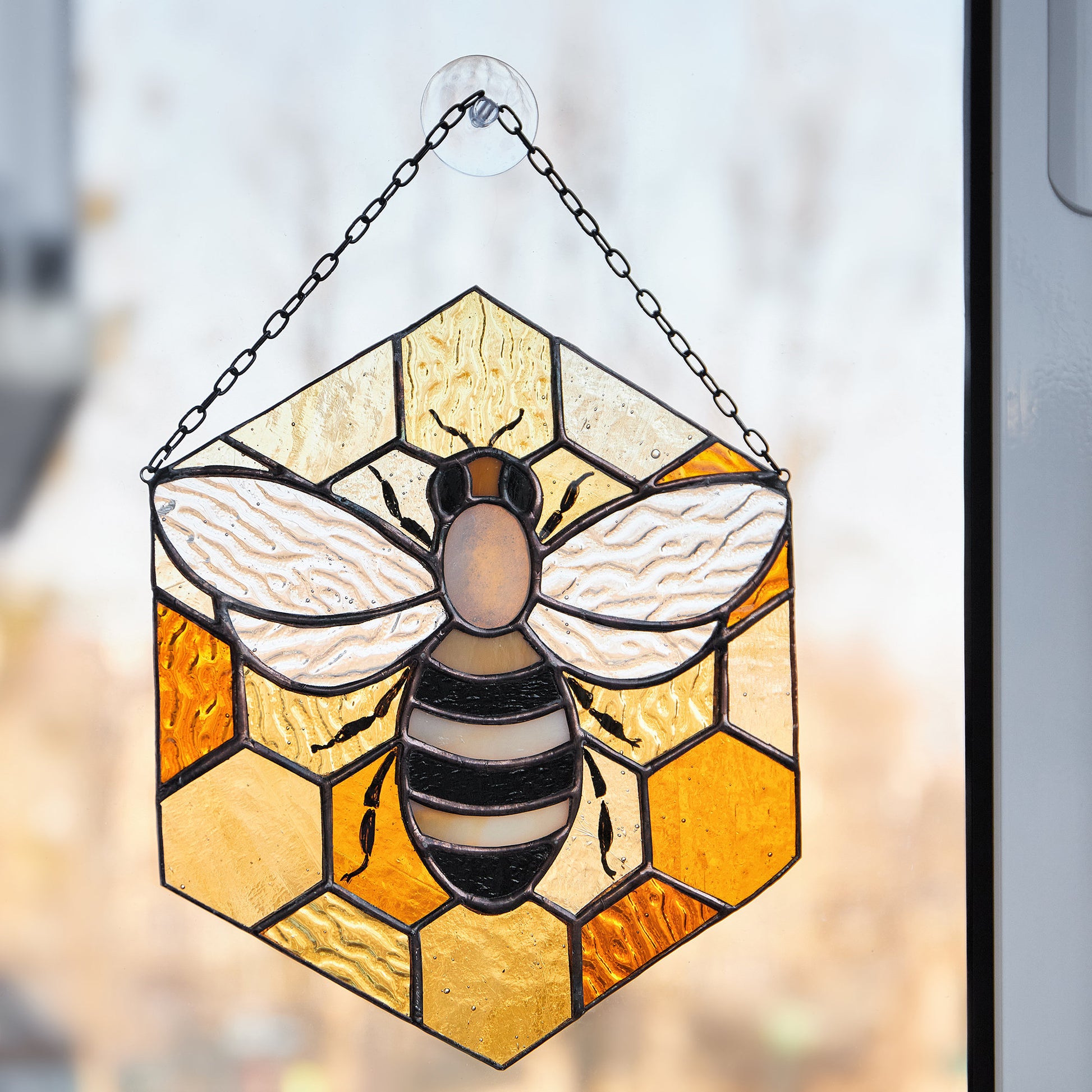 This handmade stained glass bee and honeycomb design is a buzz-worthy addition to any window. Crafted with colorful art glass, each piece is soldered with care, and we've added some painted details to give it extra flair. The black patina finish ties it all together, creating a look that's truly sweet.