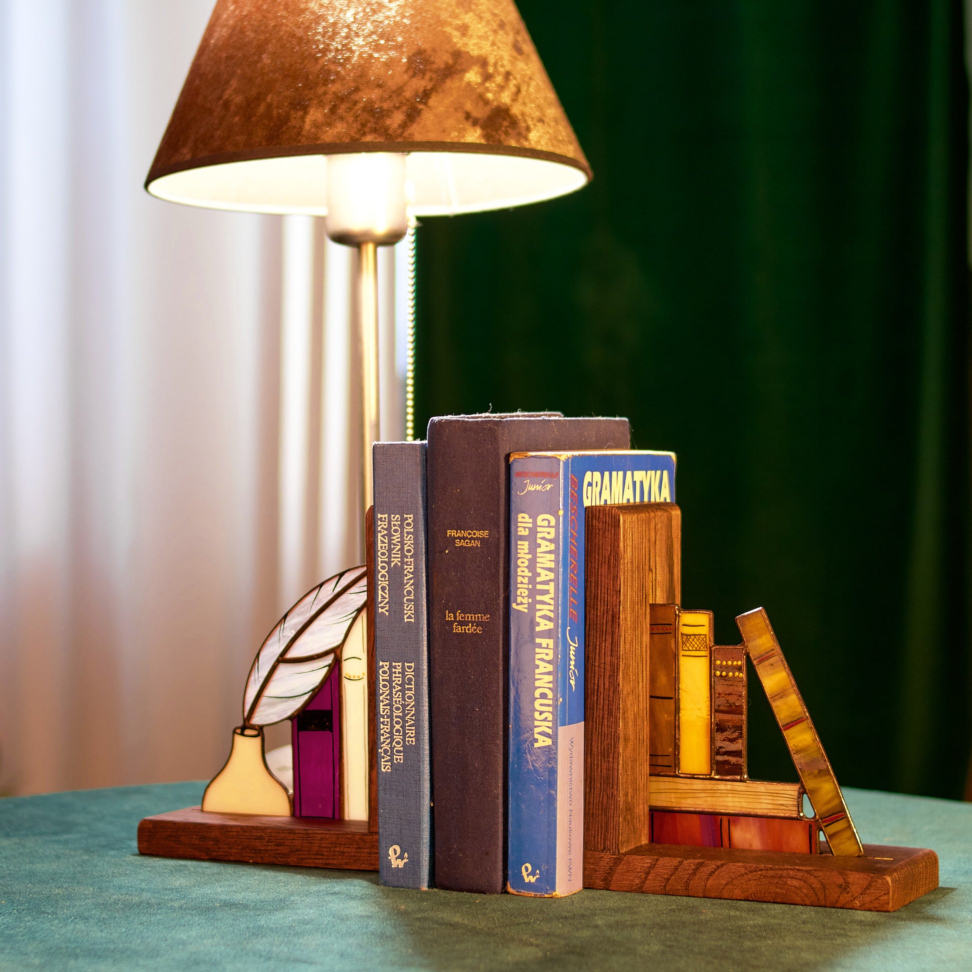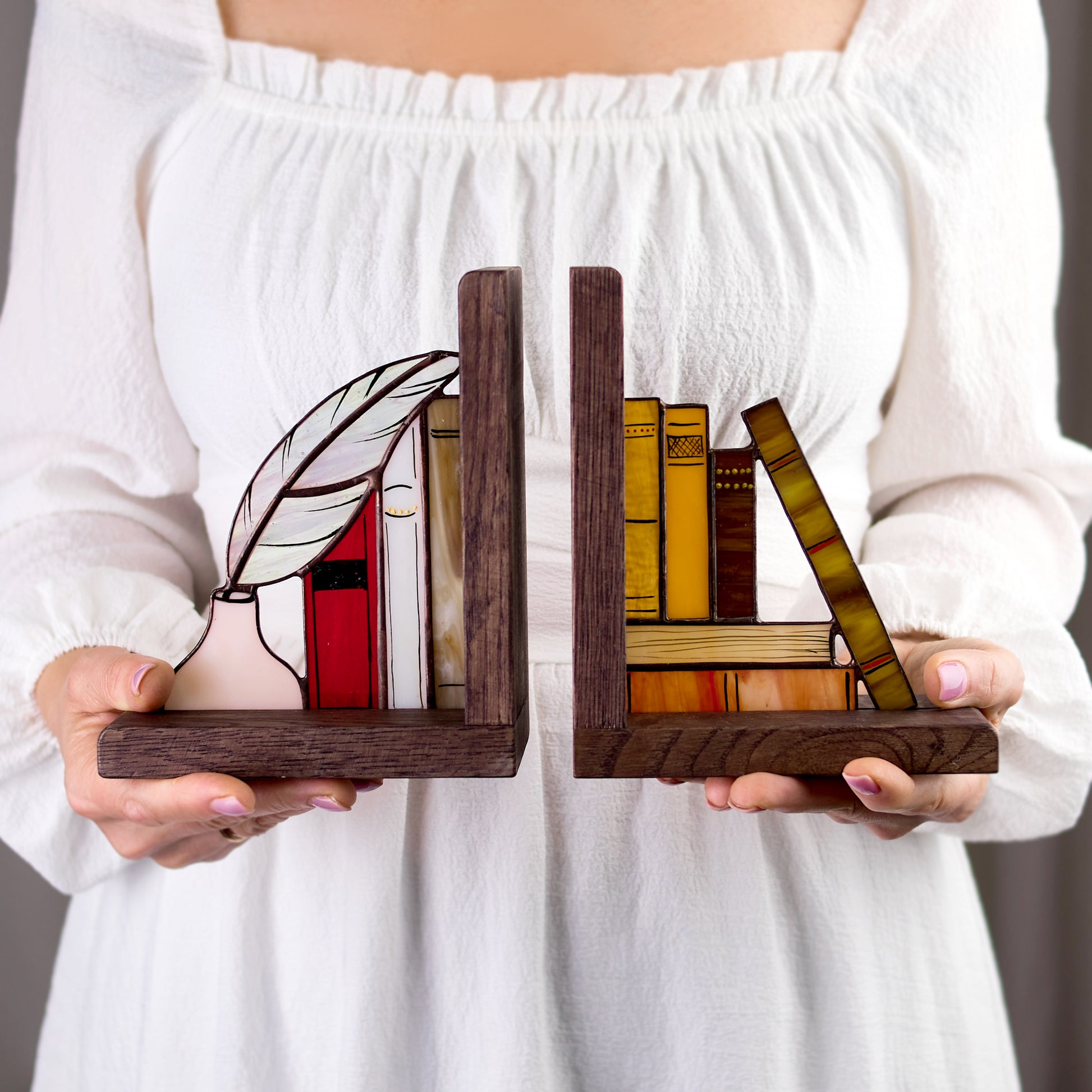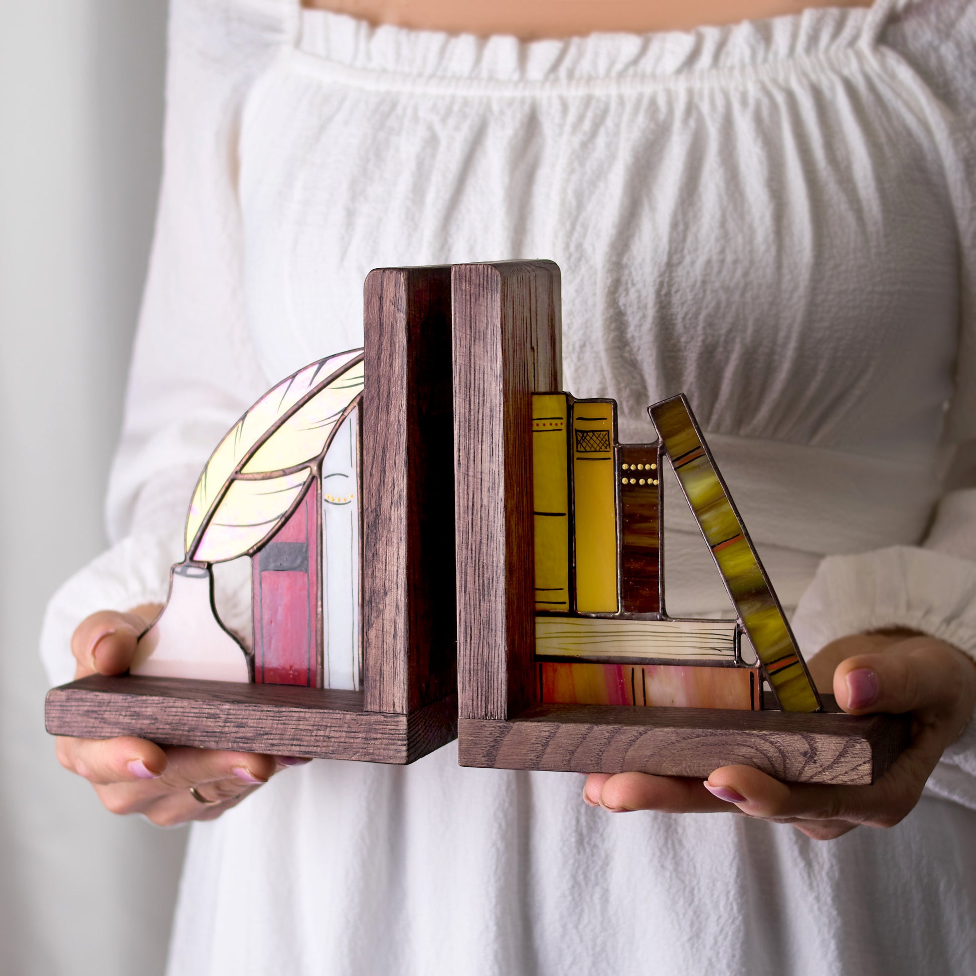These stained glass bookends bring a literary touch to any bookshelf. One side features a quill in an ink bottle, while the other showcases a stack of books in warm amber, red, and ivory tones. Handcrafted using the Tiffany technique, each piece is set in a sturdy wooden base, available in dark or light oak. A perfect gift for book lovers and a beautiful addition to any home library or study.