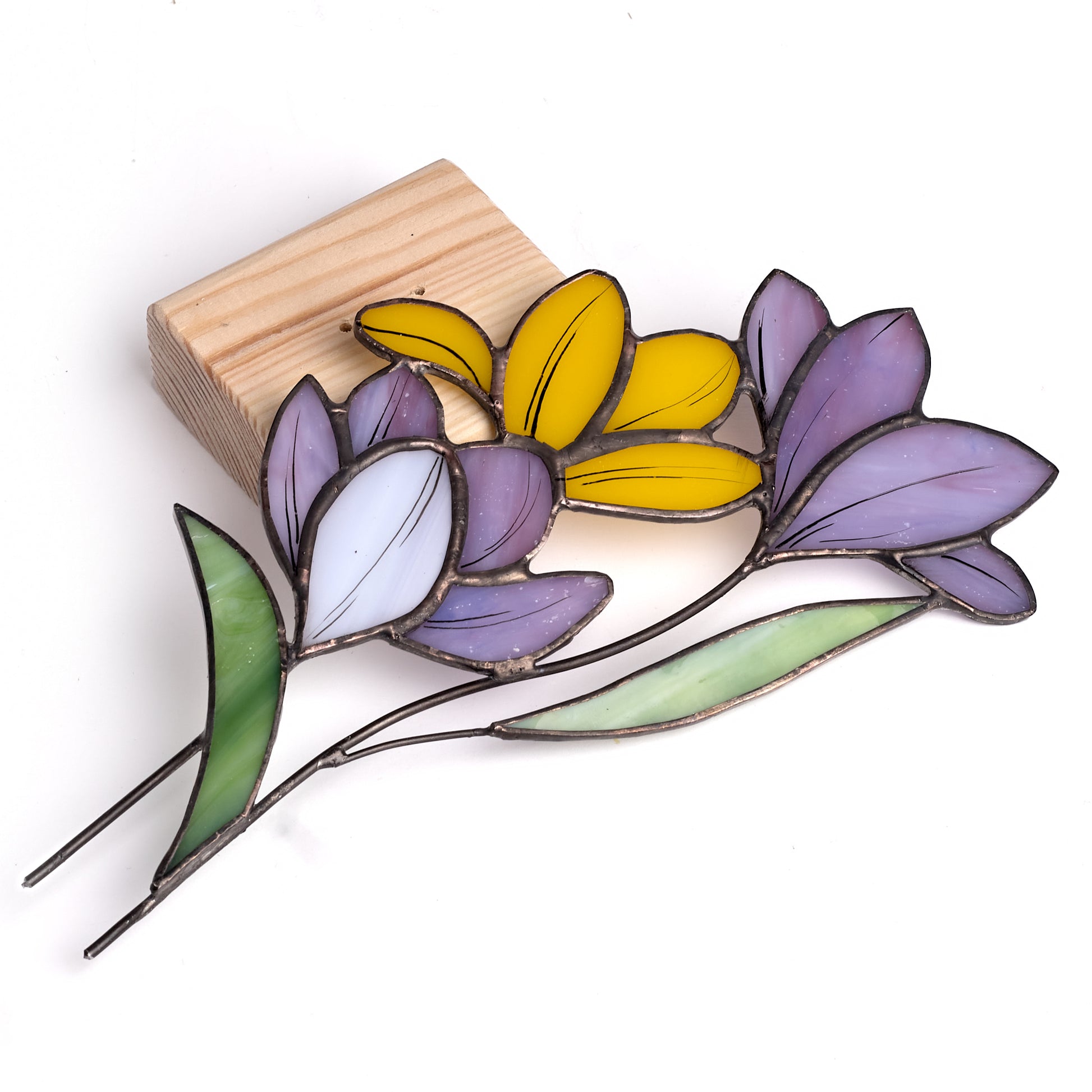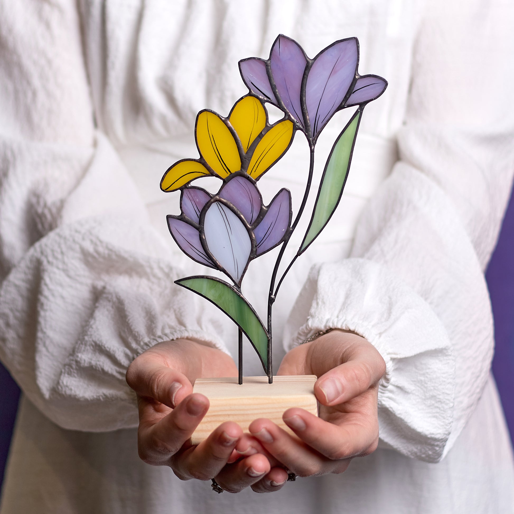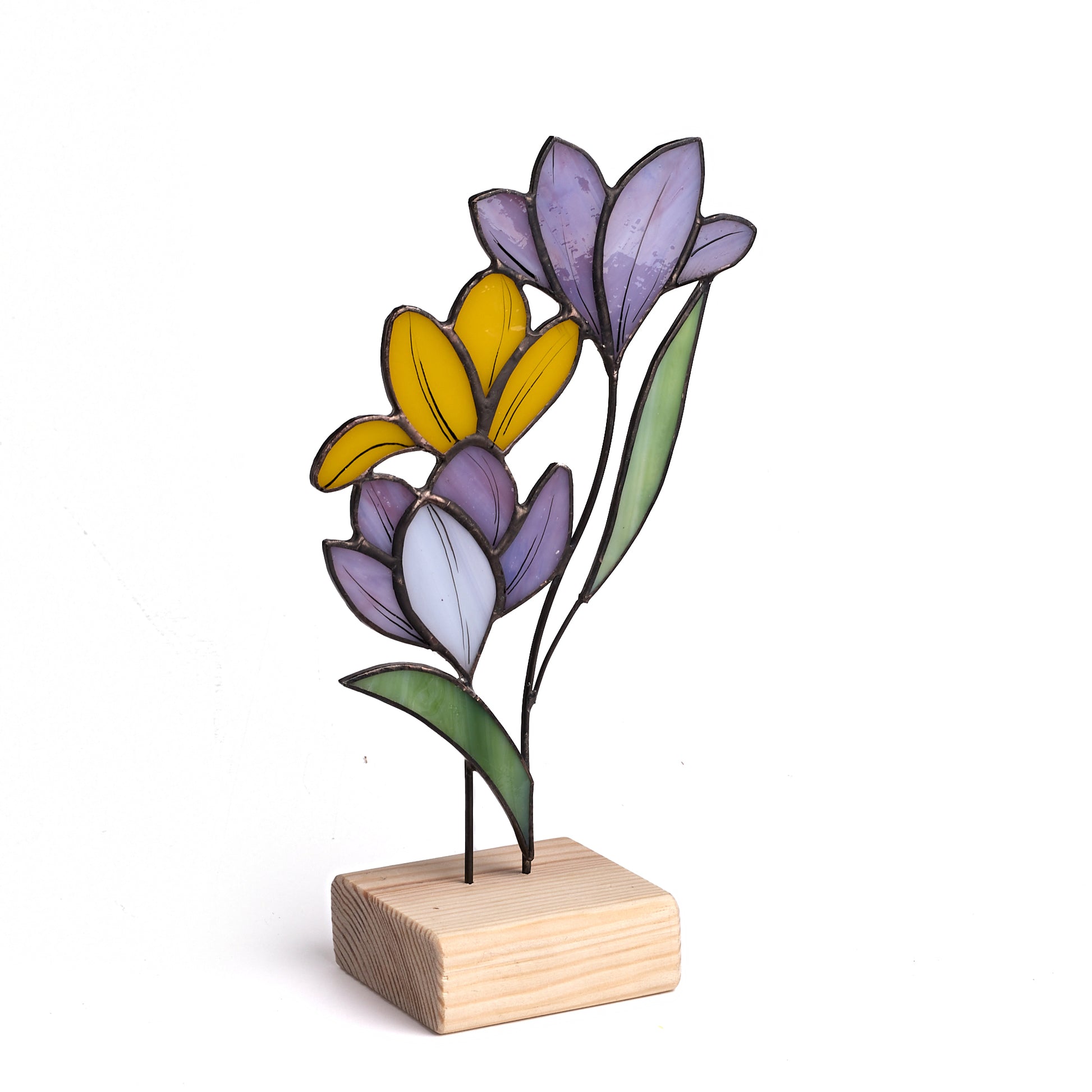 Looking to bring a bit of spring indoors? This handmade stained glass crocus flower is just the thing! With its cheerful purple and yellow petals, it adds a playful pop of color to any space. Perched on a rustic wooden base, it’s a sweet little reminder that brighter days are always on the way.