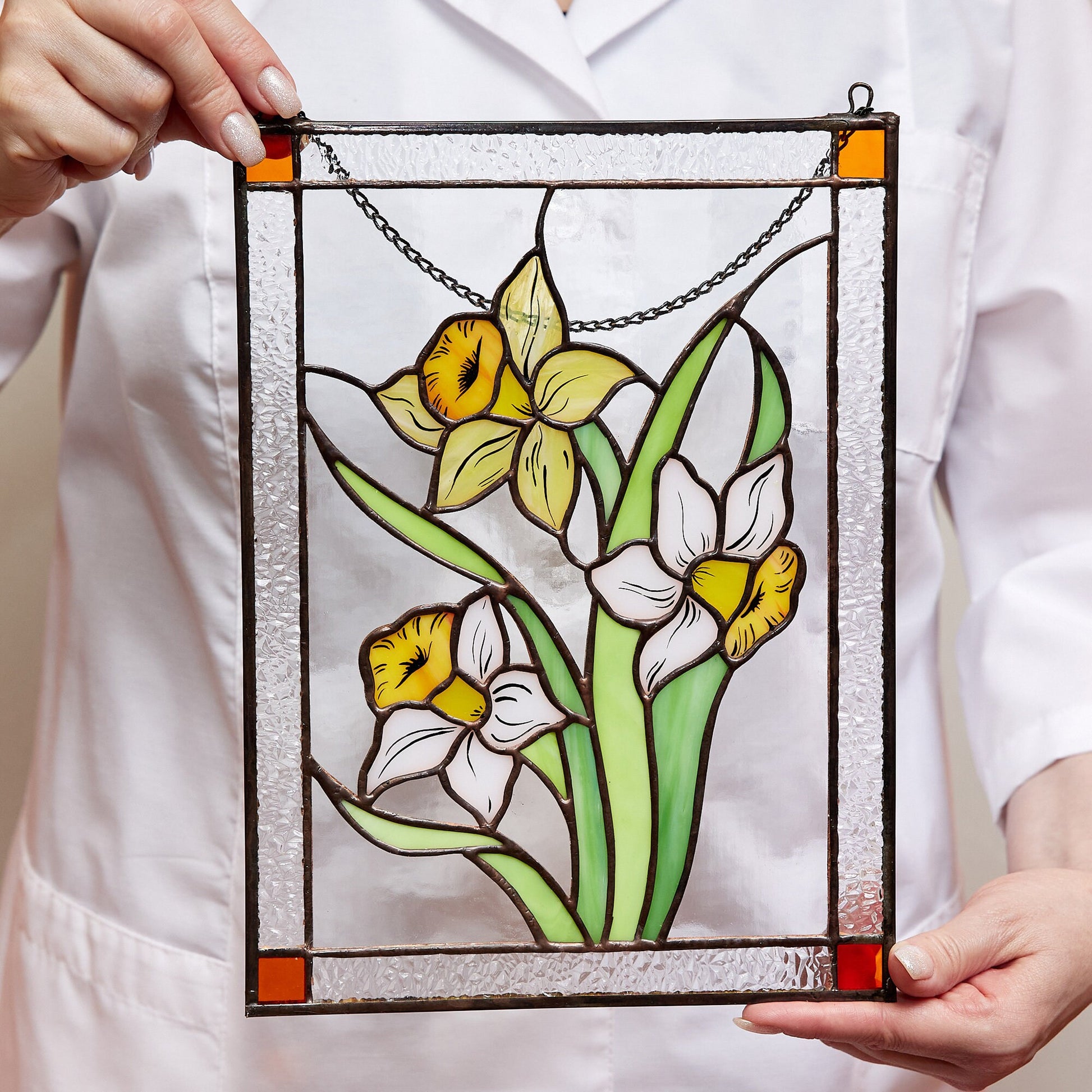 Meet your new favorite piece of home decor — a stained glass panel featuring a cheerful narcissus flower in white and yellow. This handmade beauty isn’t just a pretty face; it’s a handcrafted treasure, ready to make any room in your home feel a little more special.