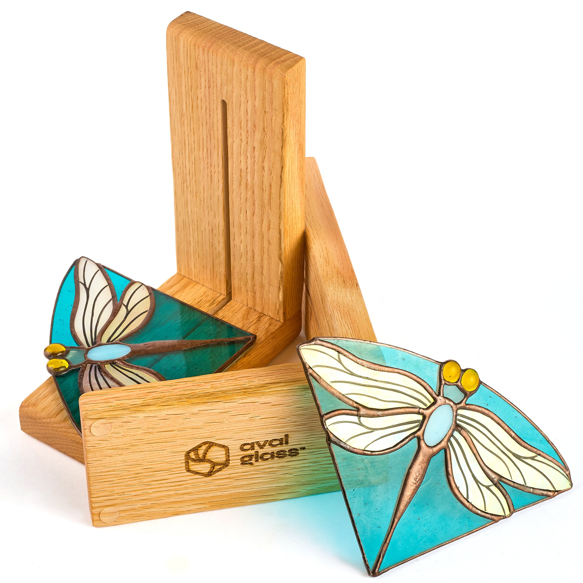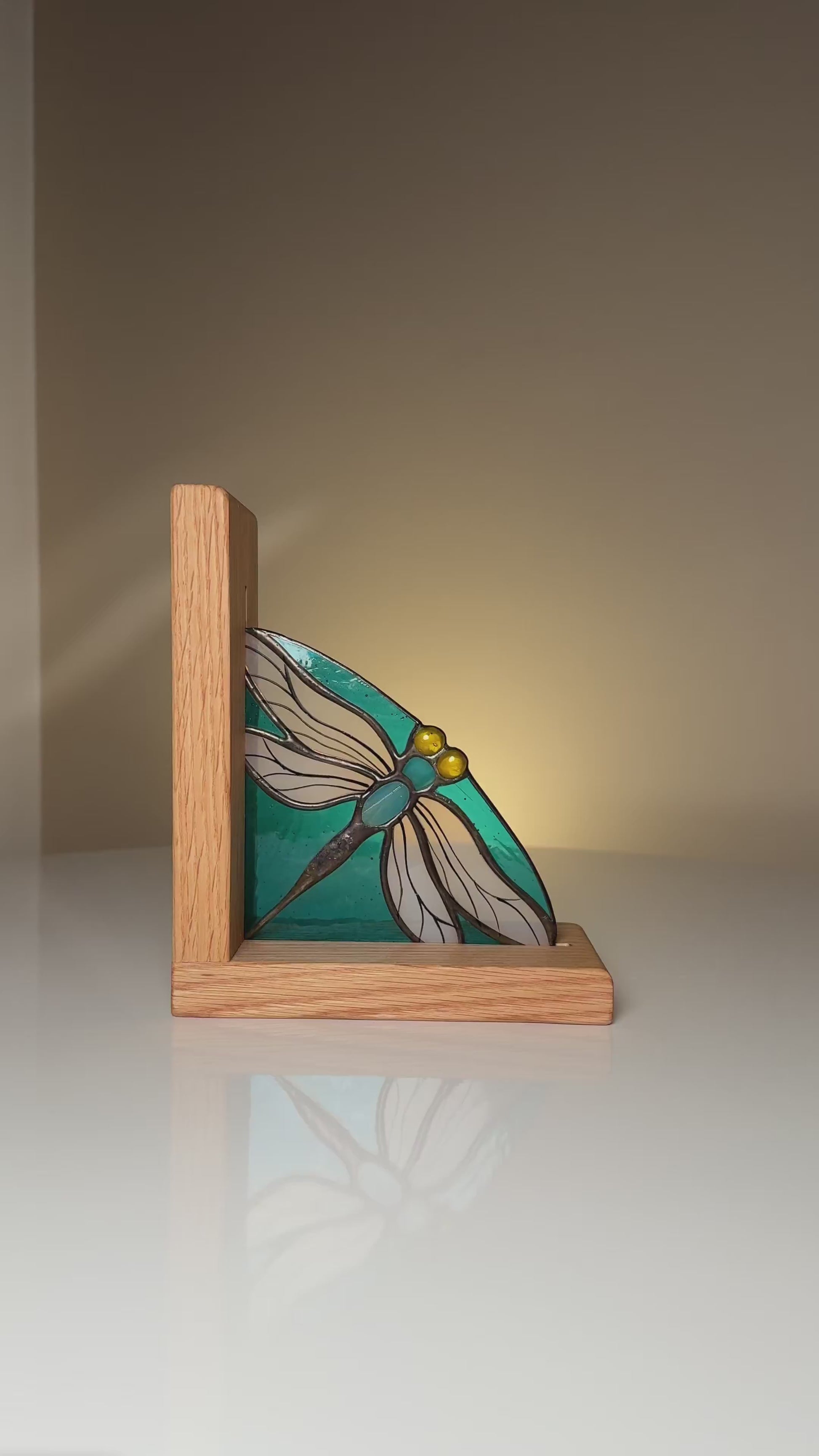 These exquisite stained glass bookends feature an elegant dragonfly design brought to life with vibrant turquoise glass panels and delicate amber accents. Handcrafted using the traditional Tiffany technique, each piece showcases intricate details, from the finely soldered wings to the polished finish that enhances its translucent glow. The sturdy oak base complements the stained glass, offering both functionality and aesthetic appeal.