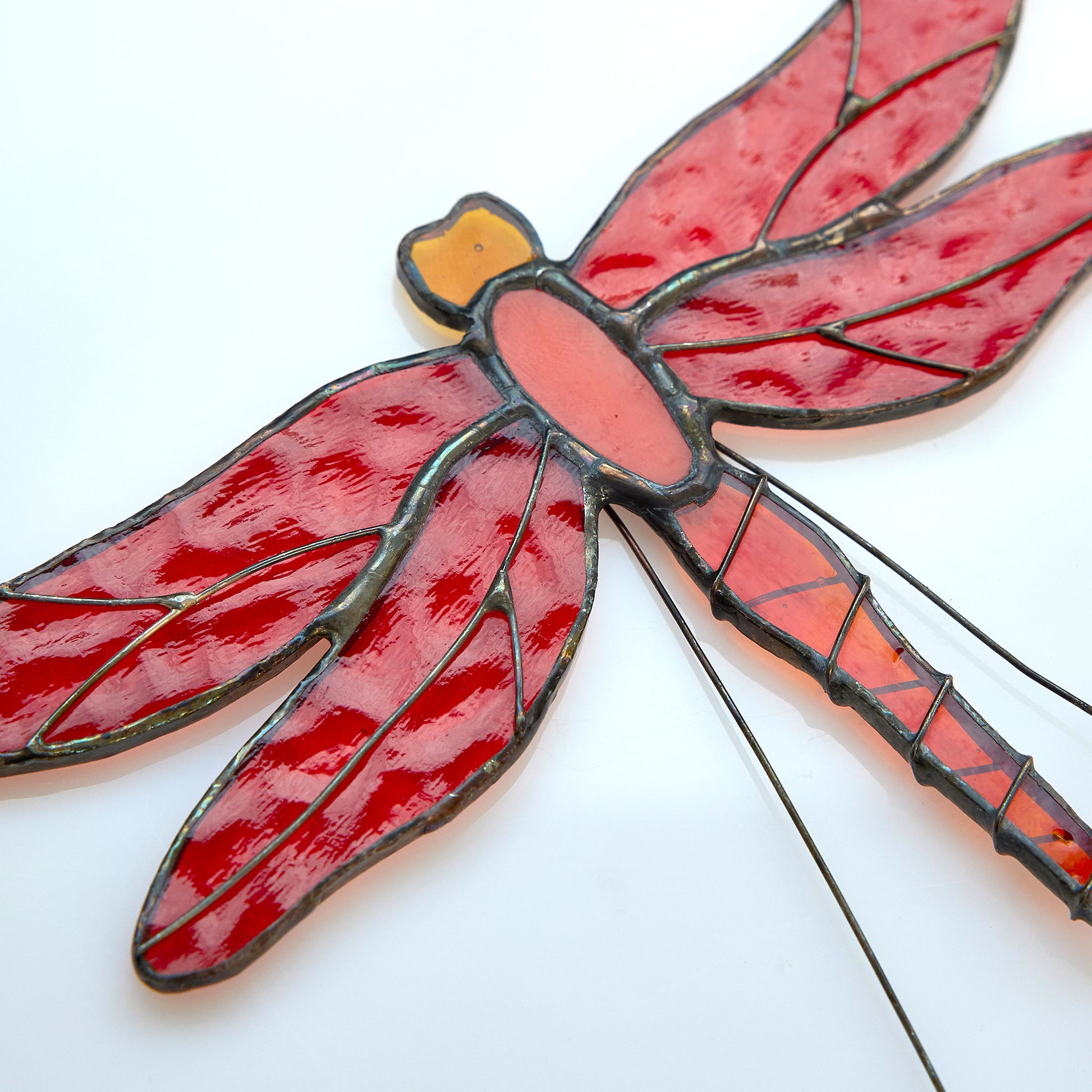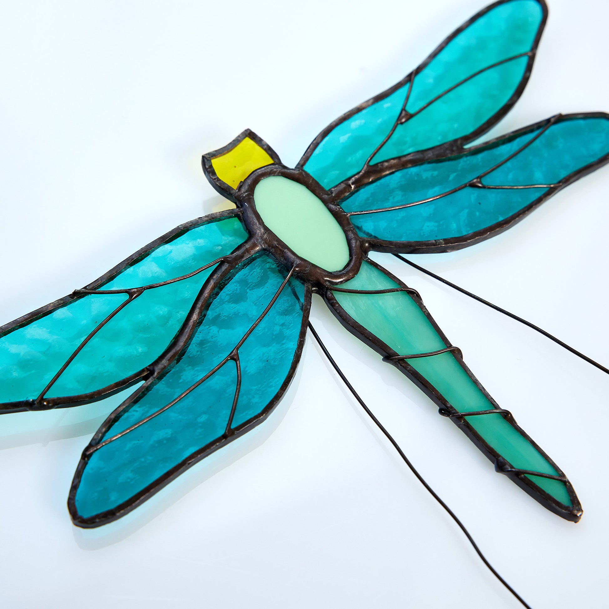 Hand crafted stained glass Dragonfly made of colorful art glass soldered using cooper foil and tin with curved wire to make it look more interesting. And black patina above
