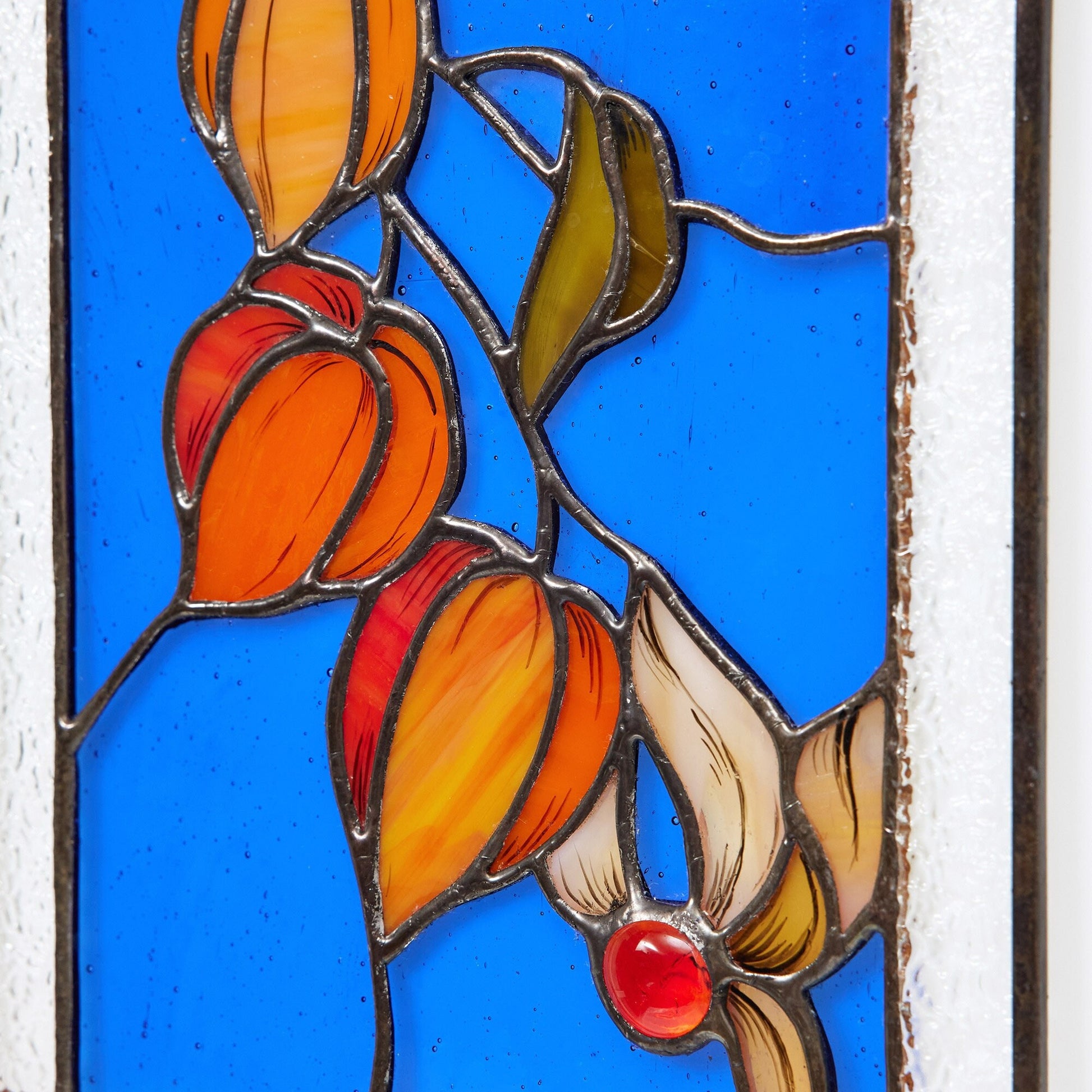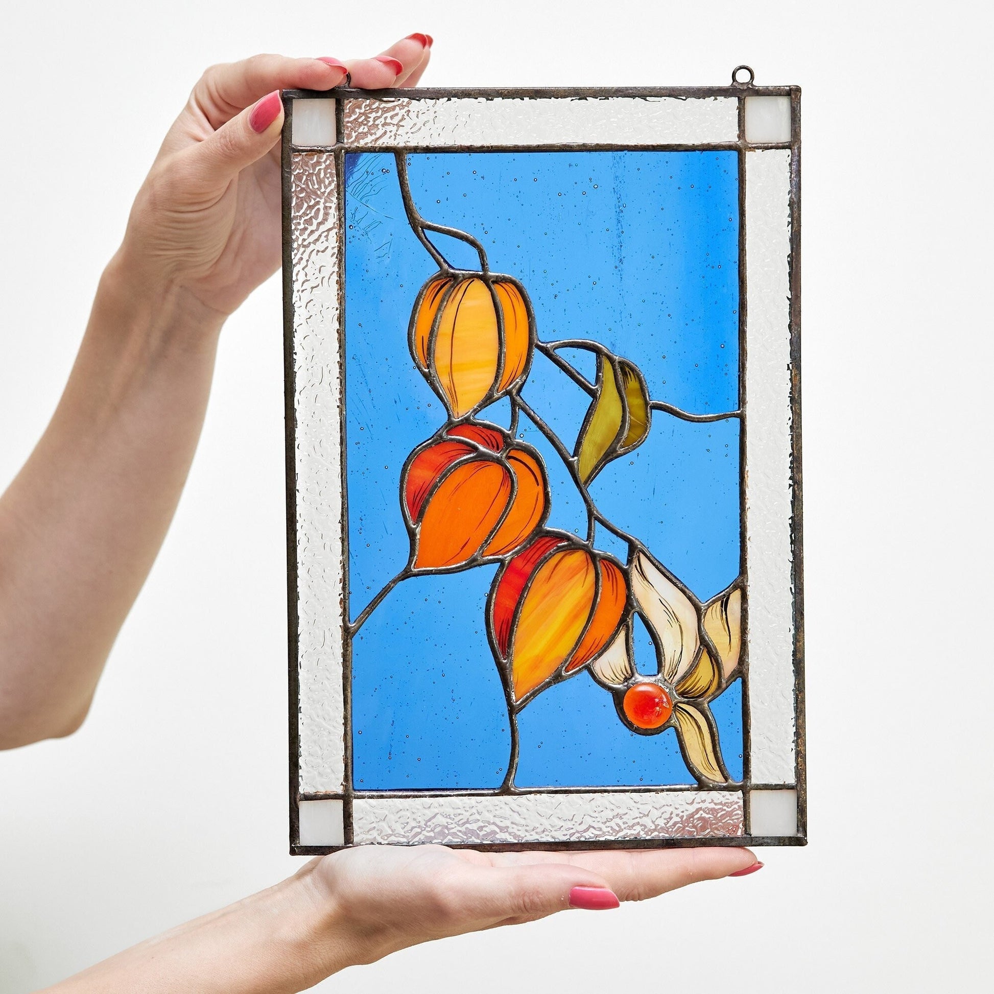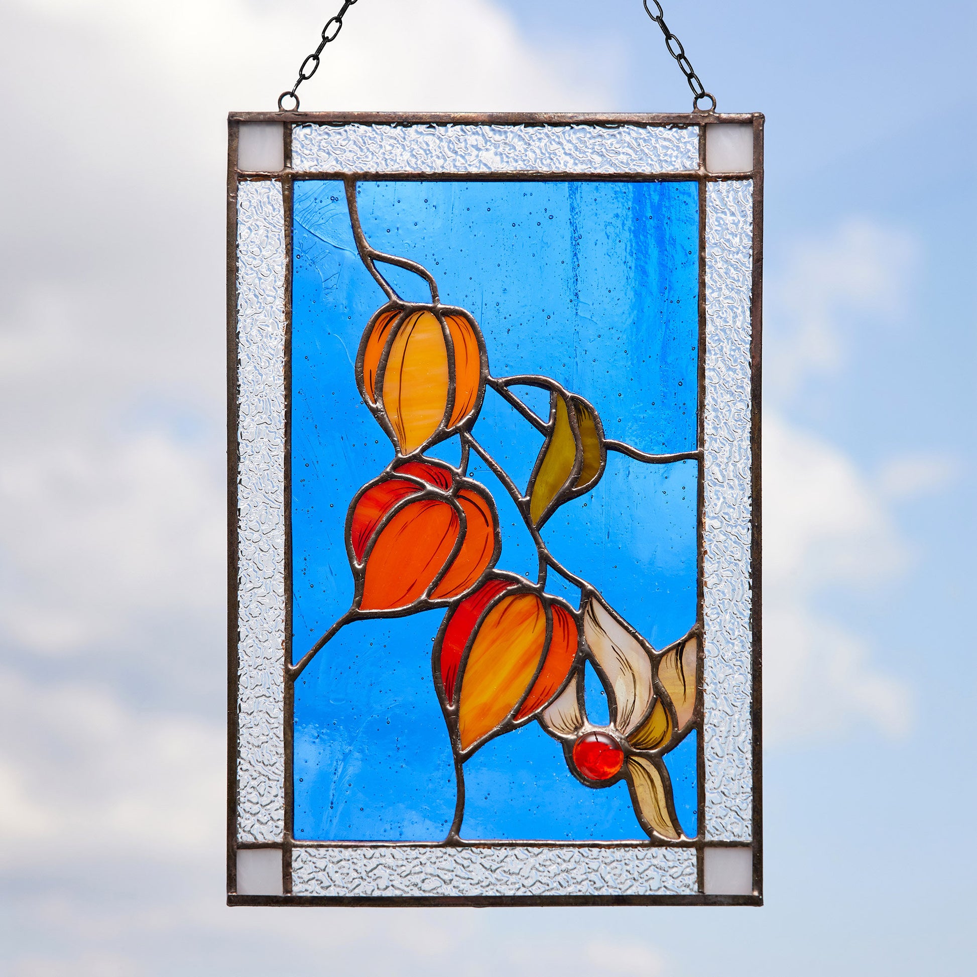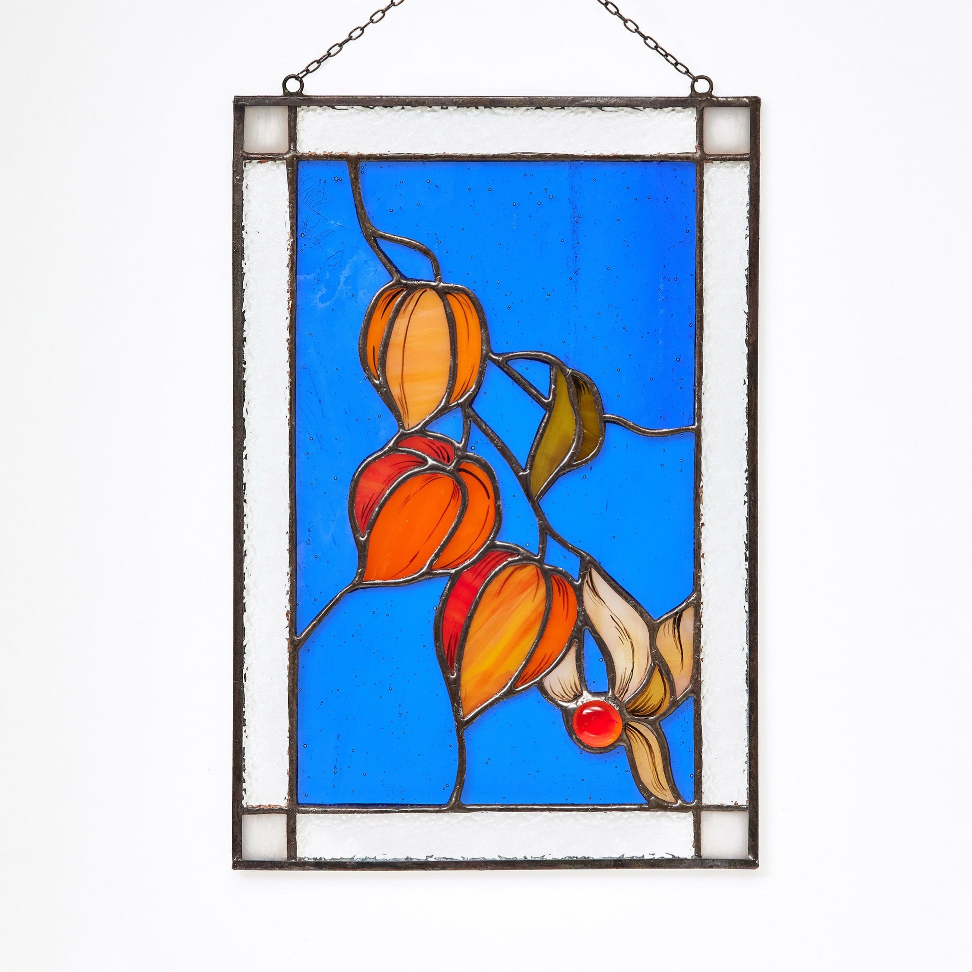 Stained glass panel with Physalis plant of orange color is an eye-catching addition to home interior. Look amazing on sun.