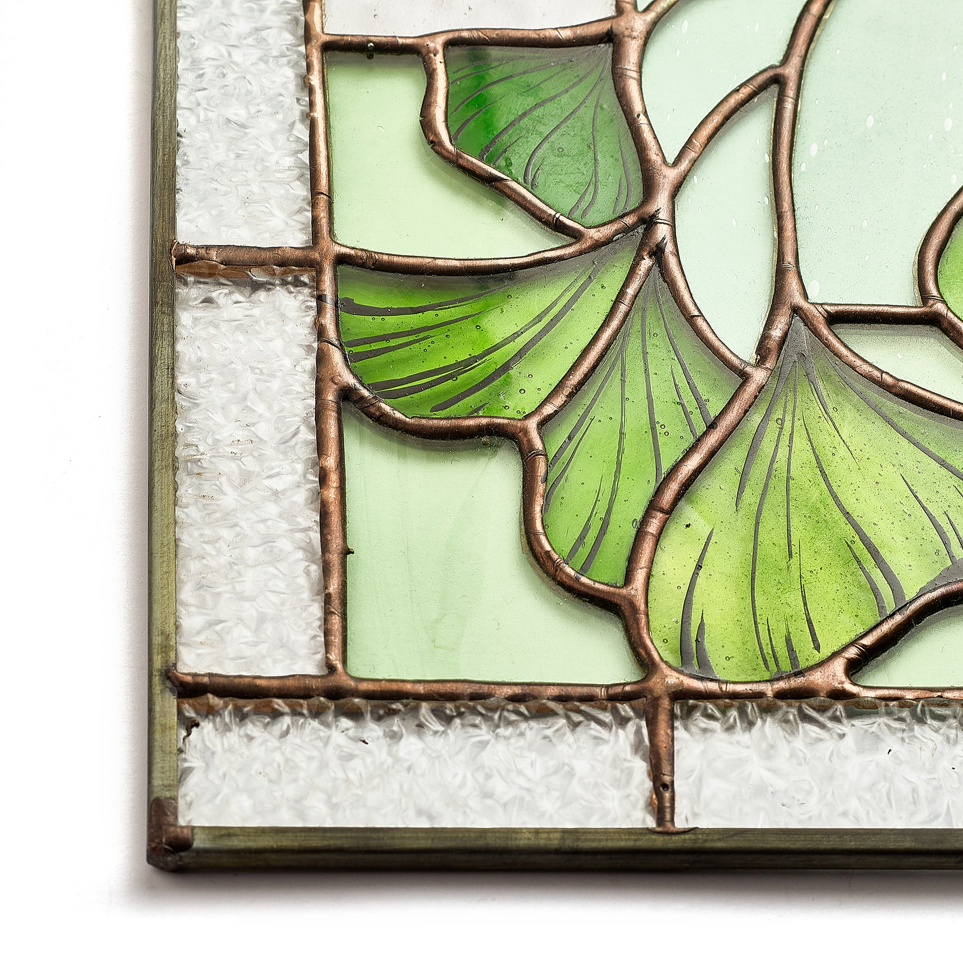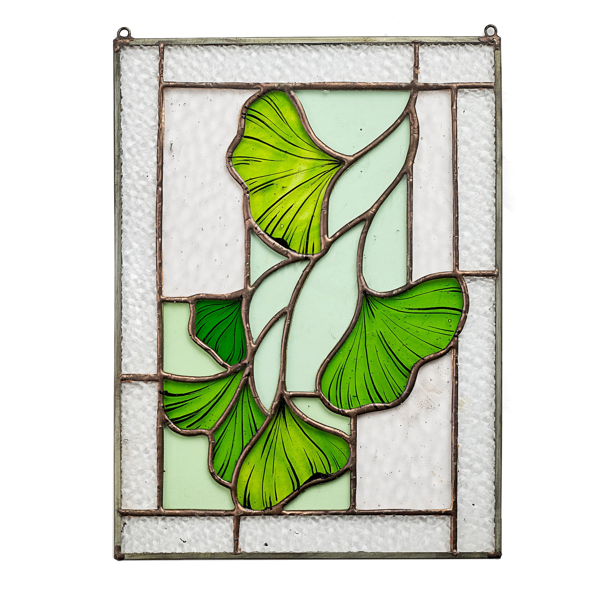 Bring the serene beauty of nature into your home with this handcrafted stained glass panel, featuring a stunning depiction of ginkgo leaves. The vibrant green tones and intricate vein details capture the elegance of these symbolic leaves, known for their resilience and timeless charm. Framed with a textured backdrop of frosted and light mint glass, this piece is designed to bathe your space in soft, diffused light.