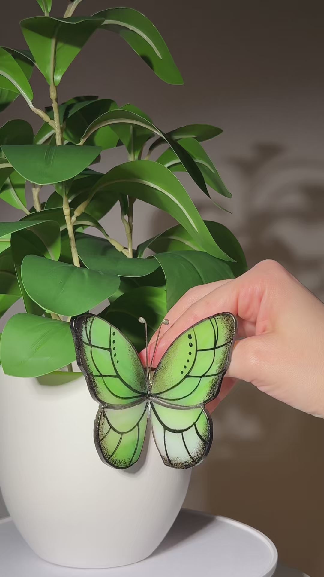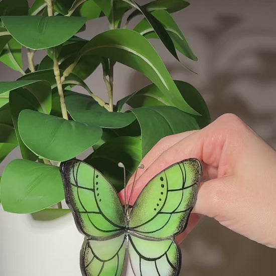 Bring a pop of nature to your plant pots with this stunning green stained glass butterfly pot hanger! Perfect for hanging on the edge of any planter, this handcrafted butterfly creates a gorgeous sun catcher effect with its vibrant green wings and delicate black detailing. Whether for indoor plants, outdoor garden decor, or as a thoughtful gift, this butterfly adds a unique, whimsical touch to your greenery.