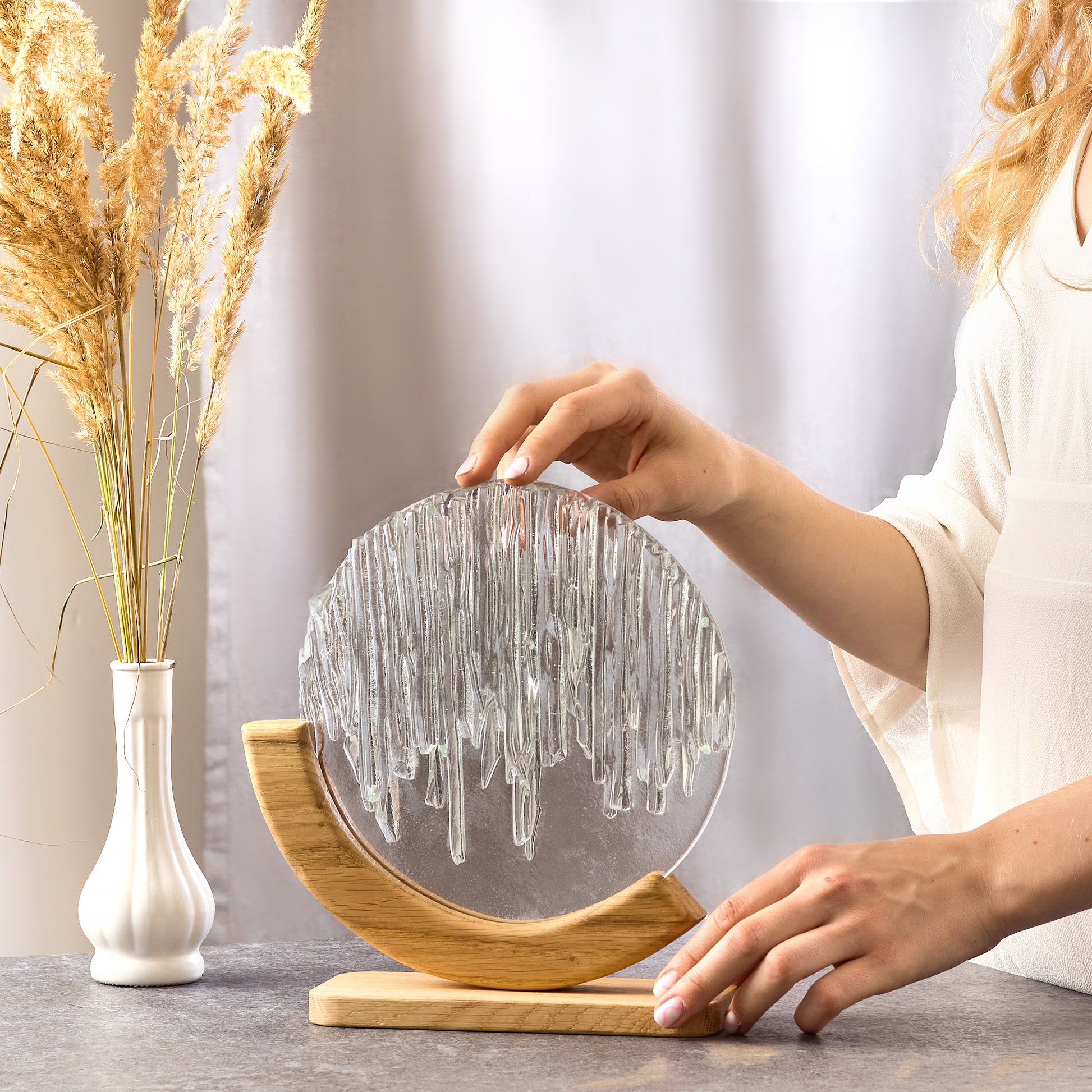 The design is beautifully complemented by a curved oak base, adding warmth and balance to the cool, crystalline aesthetic of the glass. The combination of glass and wood brings a harmonious blend of natural materials and artistic precision.