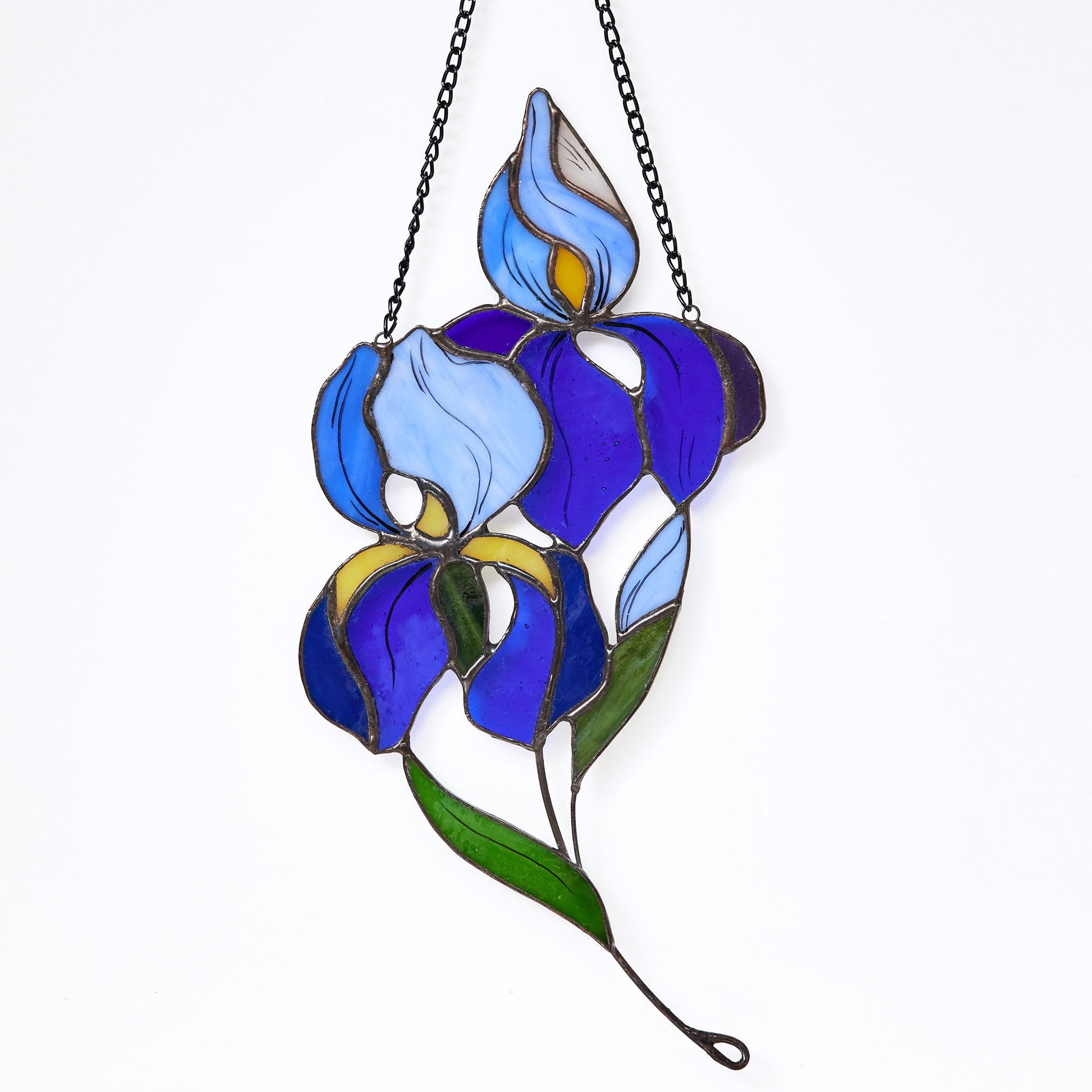 The iris flower is depicted in stunning detail with its delicate petals and vivid colors. The suncatcher is designed to be hung in a window, where it will catch the sunlight and create a beautiful display of colors and patterns. Item has 3 holes, so you can hang it as you wish horizontal or vertical.