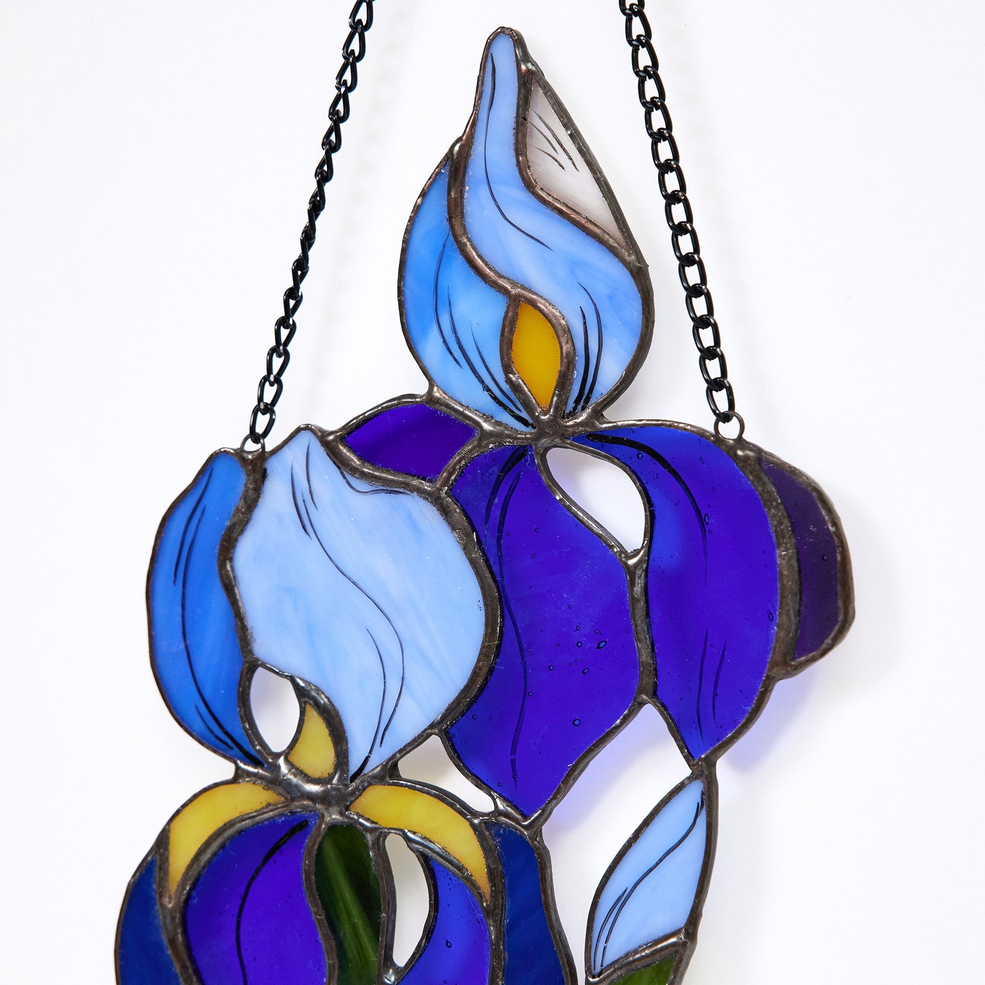 Hand crafted stained glass hanging iris flower made of colorful art glass soldered using cooper foil and tin with black patina above and some painting for add details and make it look more interesting. This stained glass iris flower suncatcher is perfect for those who appreciate handmade crafts and unique, one-of-a-kind pieces that are both functional and beautiful. Whether you hang it in a living room window, a bedroom skylight, or a sunroom, this suncatcher is sure to be a conversation starter and a cherished item for years to come. It is also a thoughtful and unique gift for flower lovers and garden enthusiasts.