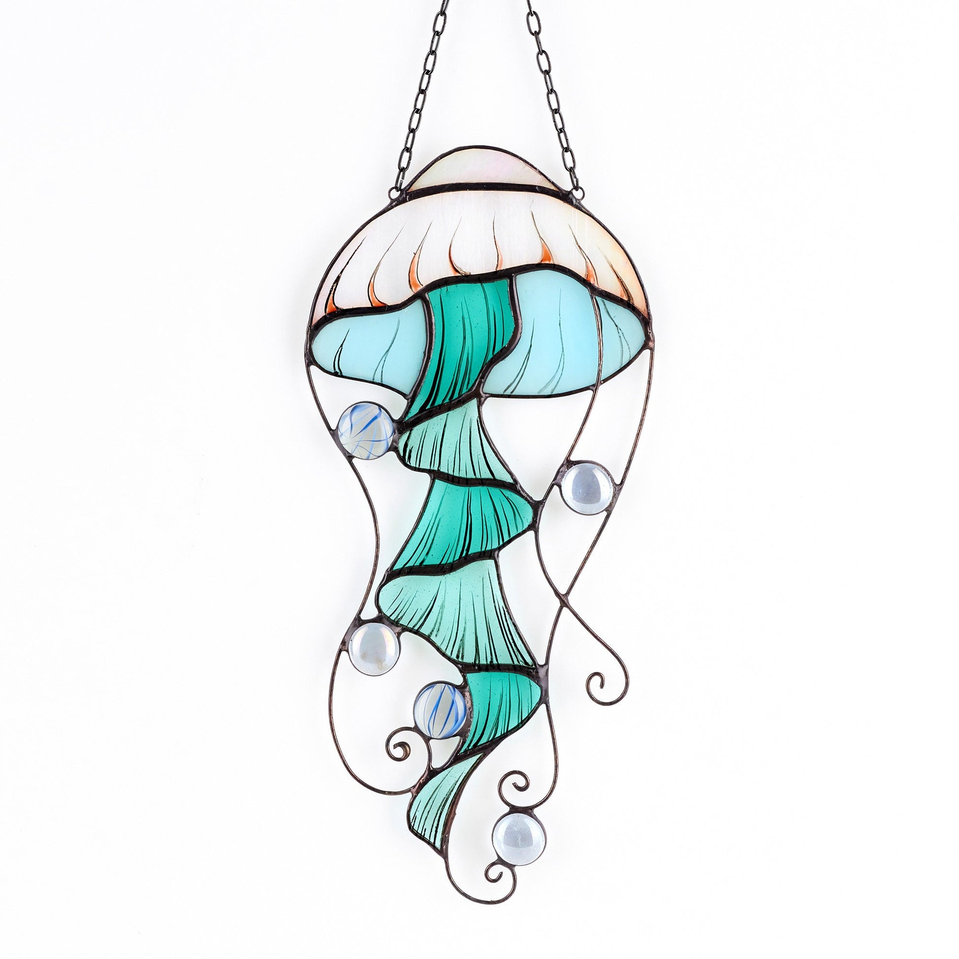 Hand crafted stained glass hanging Jellyfish suncatcher made in Tiffany technique, made of colorful art glass, marble glass, cooper foil, tin, black patina and some painting for add details and make it look more interesting.