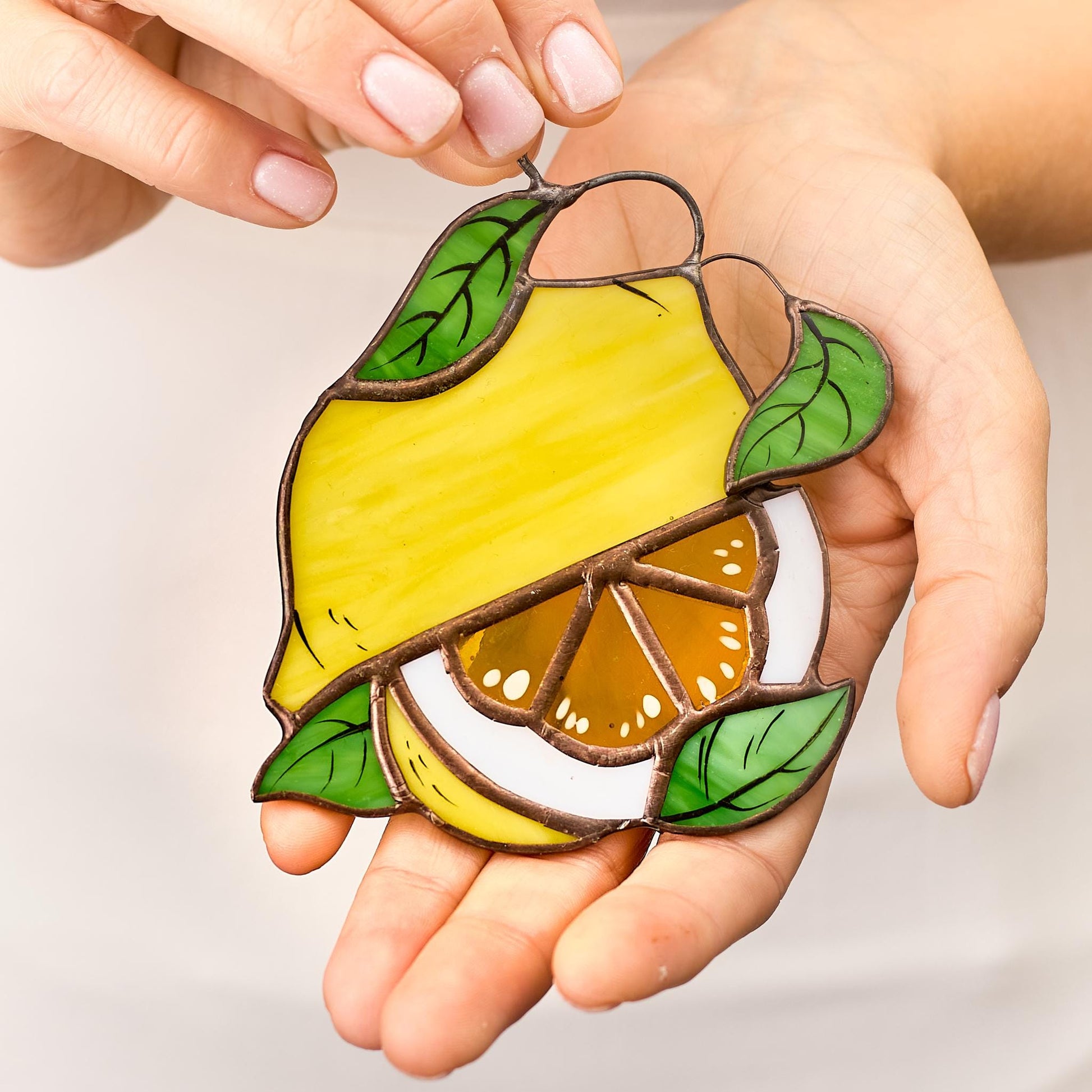 Brighten your space with this beautiful lemon stained glass suncatcher! Expertly crafted using the traditional copper foil technique, this piece showcases a vibrant yellow lemon slice paired with green leaves, adding a refreshing touch of citrus charm to any window, kitchen, or garden area. When sunlight shines through, it creates a warm and cheerful glow, making it a perfect accent for those who love nature-inspired decor.