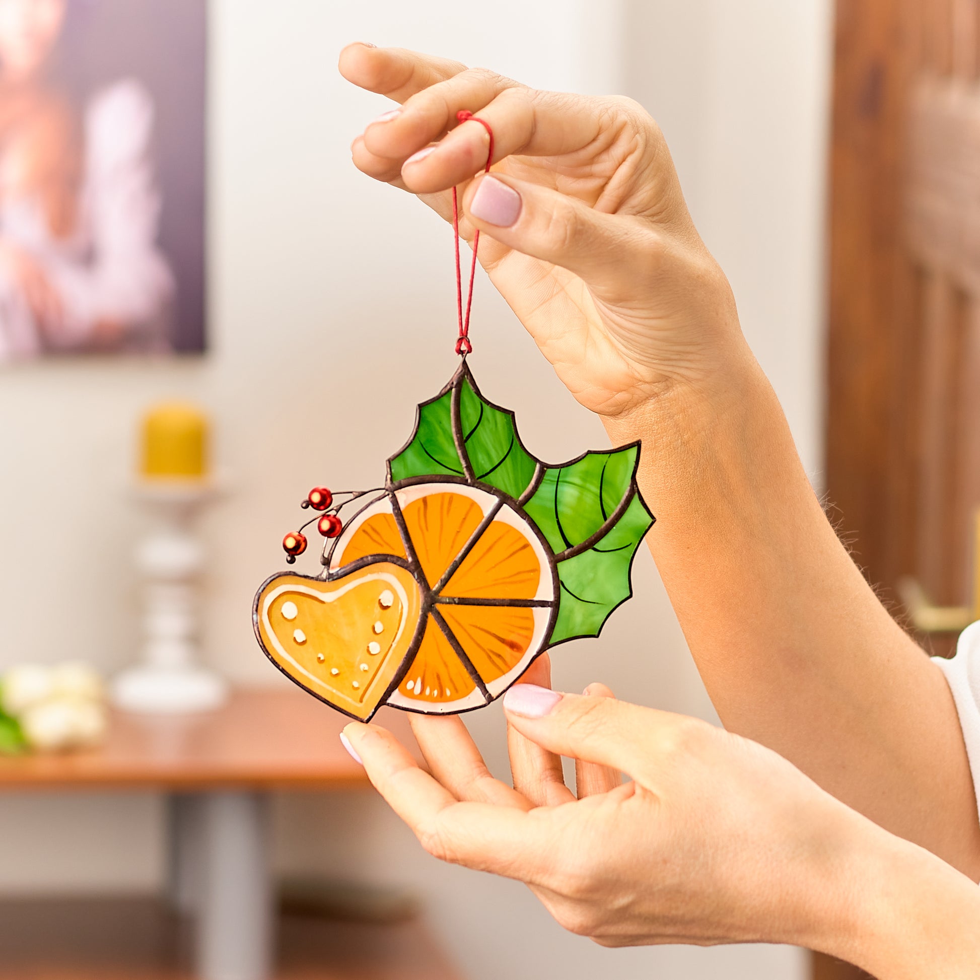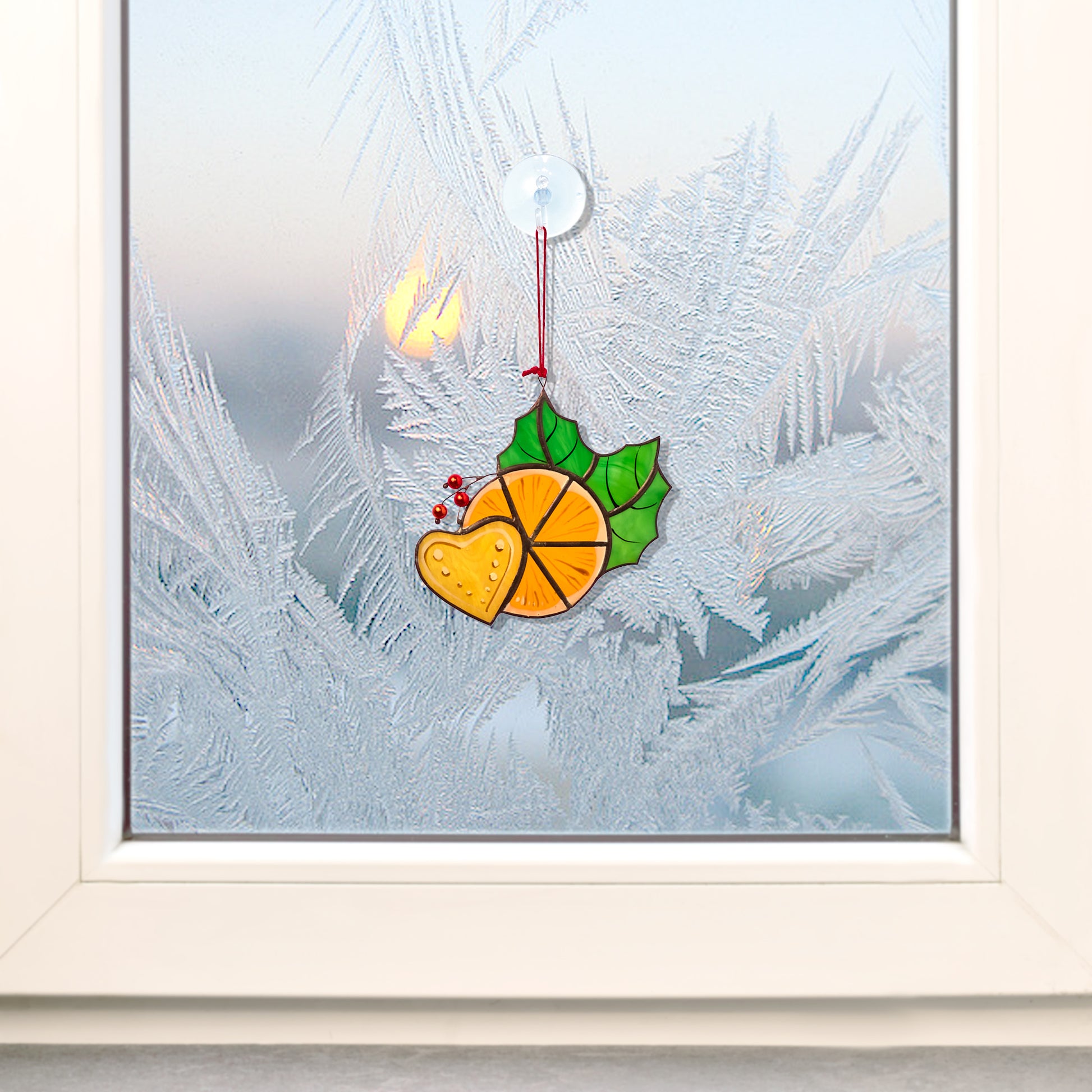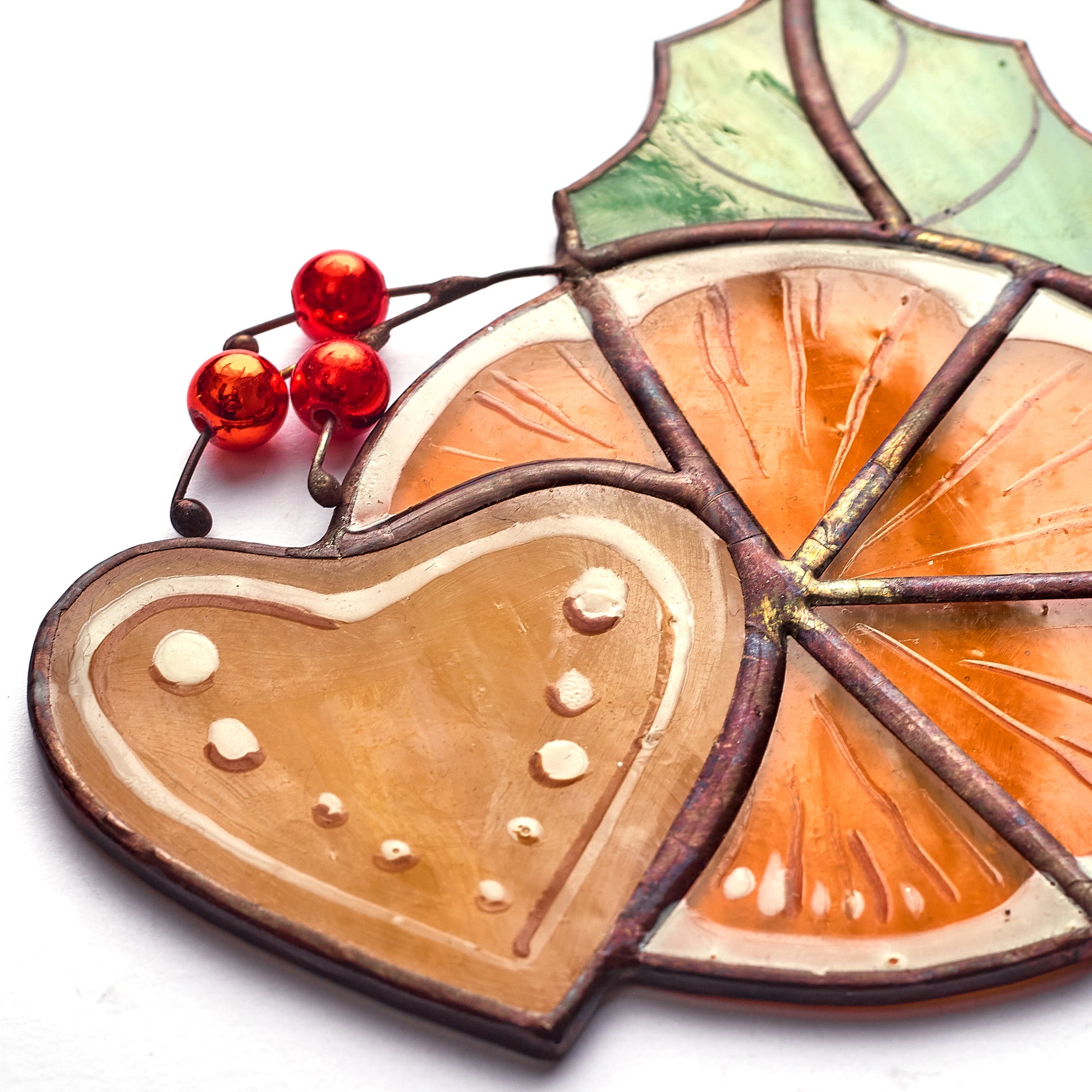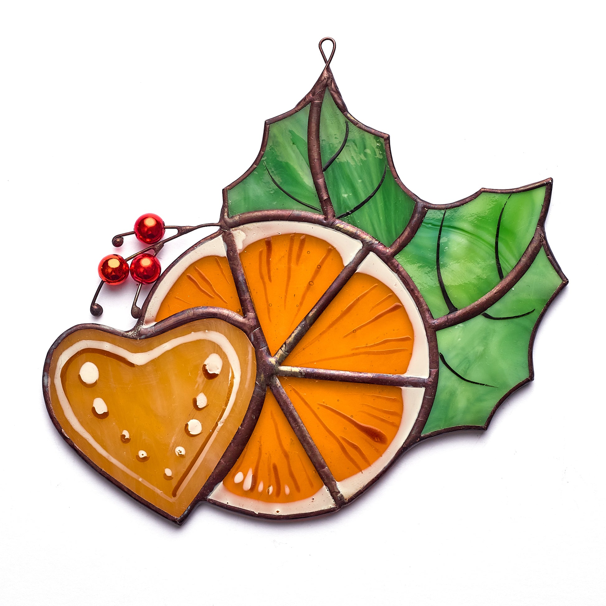 Featuring a vibrant orange slice, a gingerbread heart, and festive holly leaves with red berries, this piece captures the cozy and cheerful spirit of Christmas. Handcrafted using the traditional copper foil technique, each element is carefully soldered, ensuring both quality and durability. When sunlight shines through, it casts warm, colorful reflections, making any space feel magical.