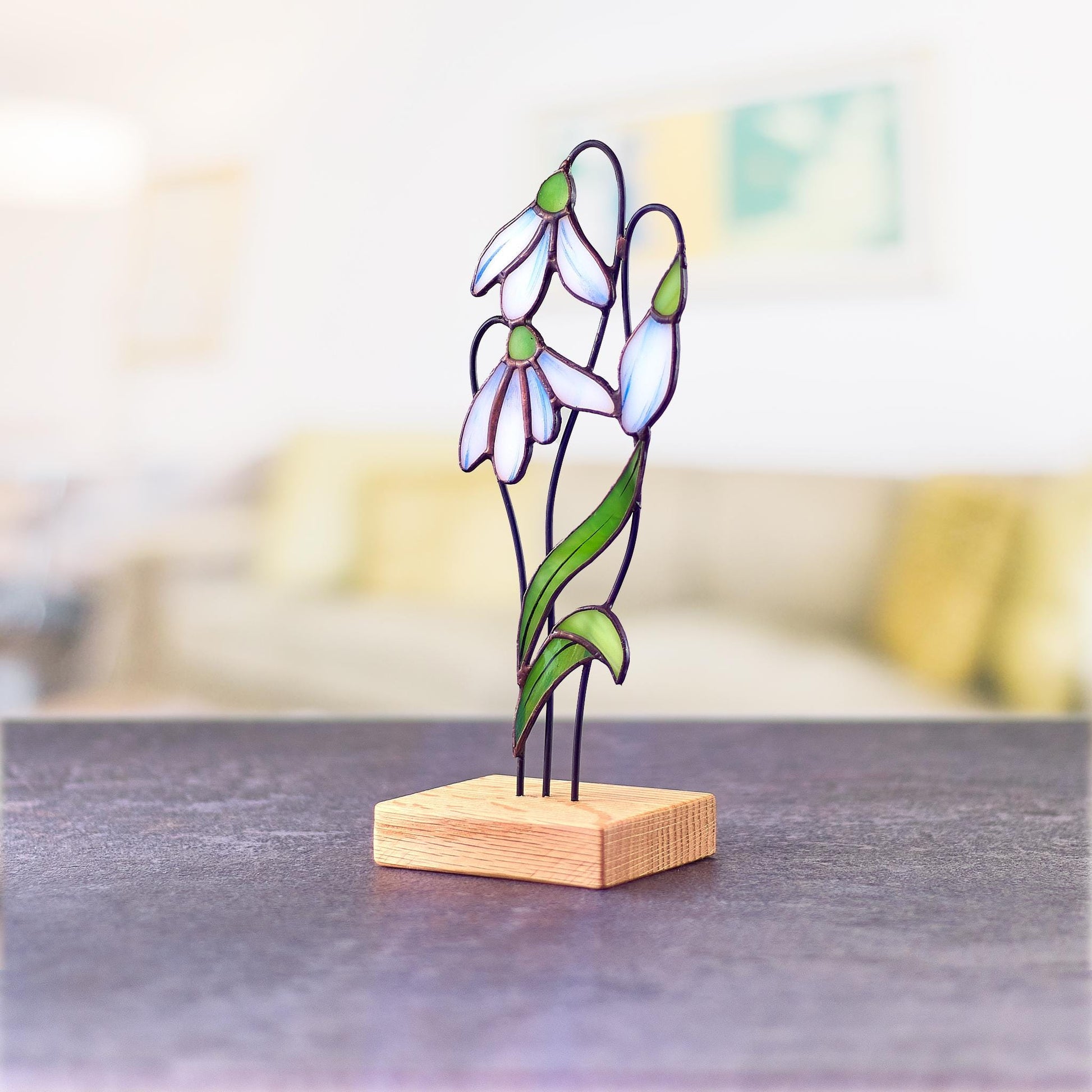 This stained glass snowdrop arrangement brings a delicate touch of spring into your home. Carefully handcrafted using the Tiffany technique, each petal is cut from milky white and soft blue glass, creating a gentle gradient that reflects light beautifully. The green glass stems and buds are accented with soft solder lines, adding definition and a natural flow to the piece. The snowdrops are mounted on a smooth wooden base, allowing them to stand freely on a shelf, windowsill, or table. Inspired by the quiet elegance of early spring blooms, this piece embodies renewal and hope. Each element is crafted with attention to detail, ensuring a unique piece of art that brightens any space. A perfect gift for flower lovers or a thoughtful addition to your seasonal décor.