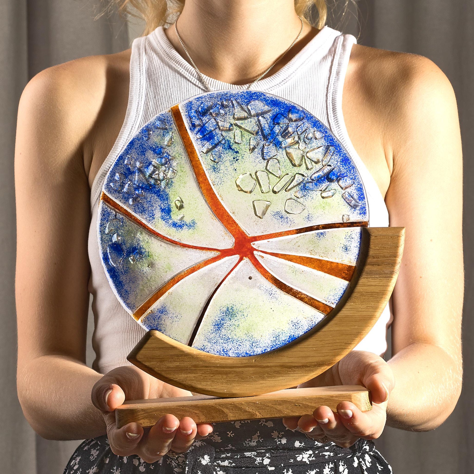 Inspired by the golden embrace of sunlight filtering through a forest canopy, the Sunburst Grove Stained Glass Stand is a radiant celebration of light and color. This round glass piece is crafted using the fusing technique, featuring warm shades of amber, red, and gold complemented by touches of earthy green and soft sky blue. Its textured surface captures the organic beauty of nature, creating a dynamic play of light and shadow.