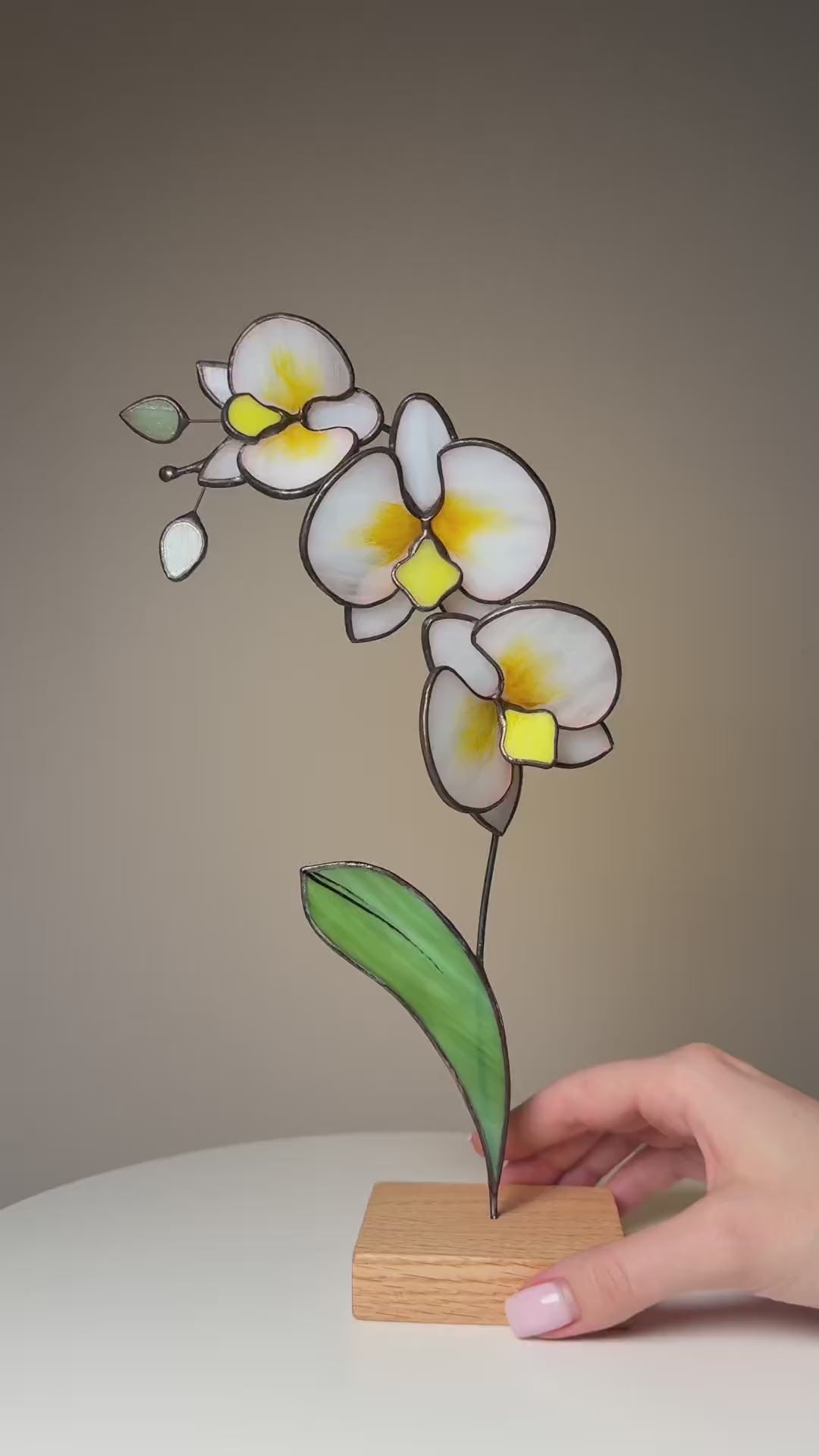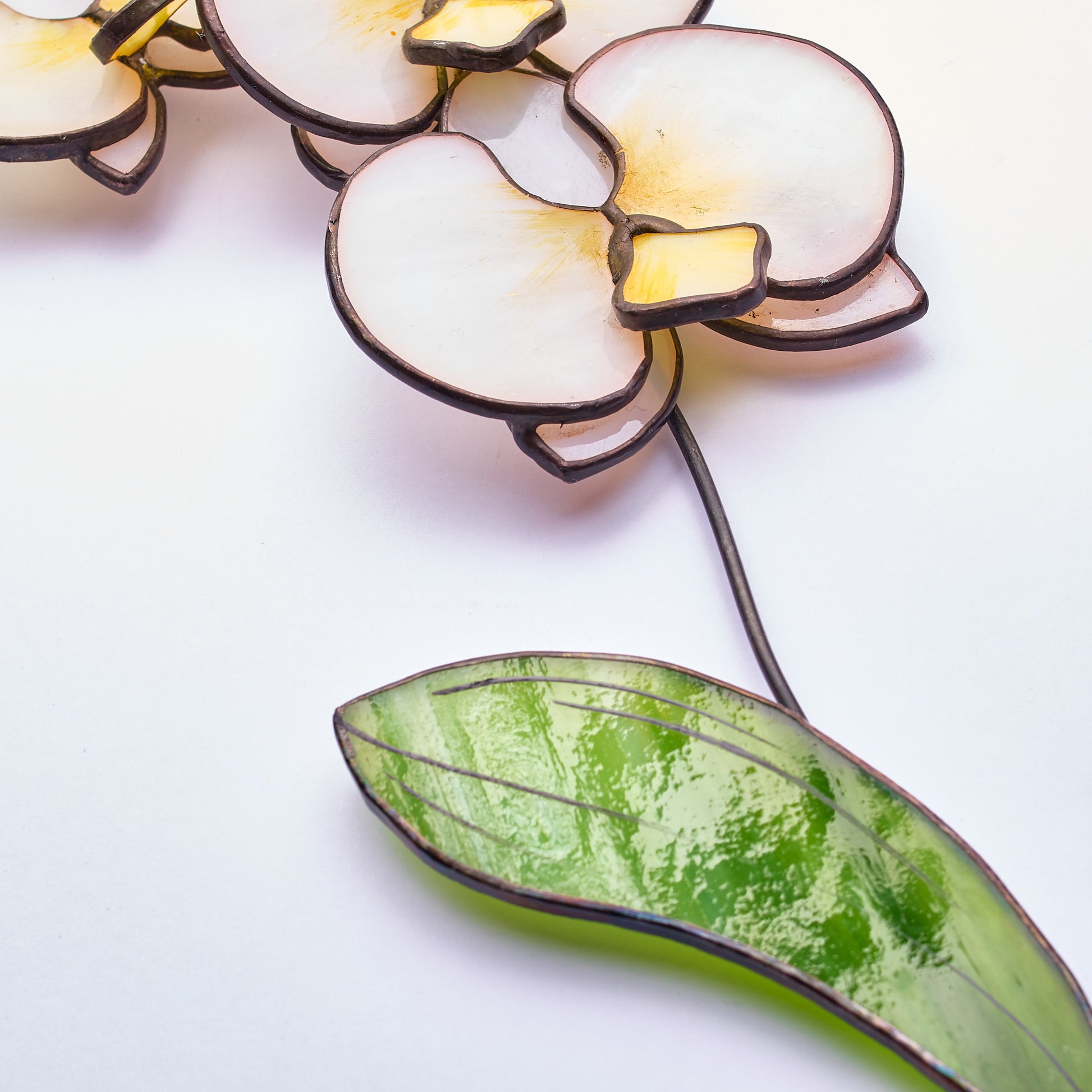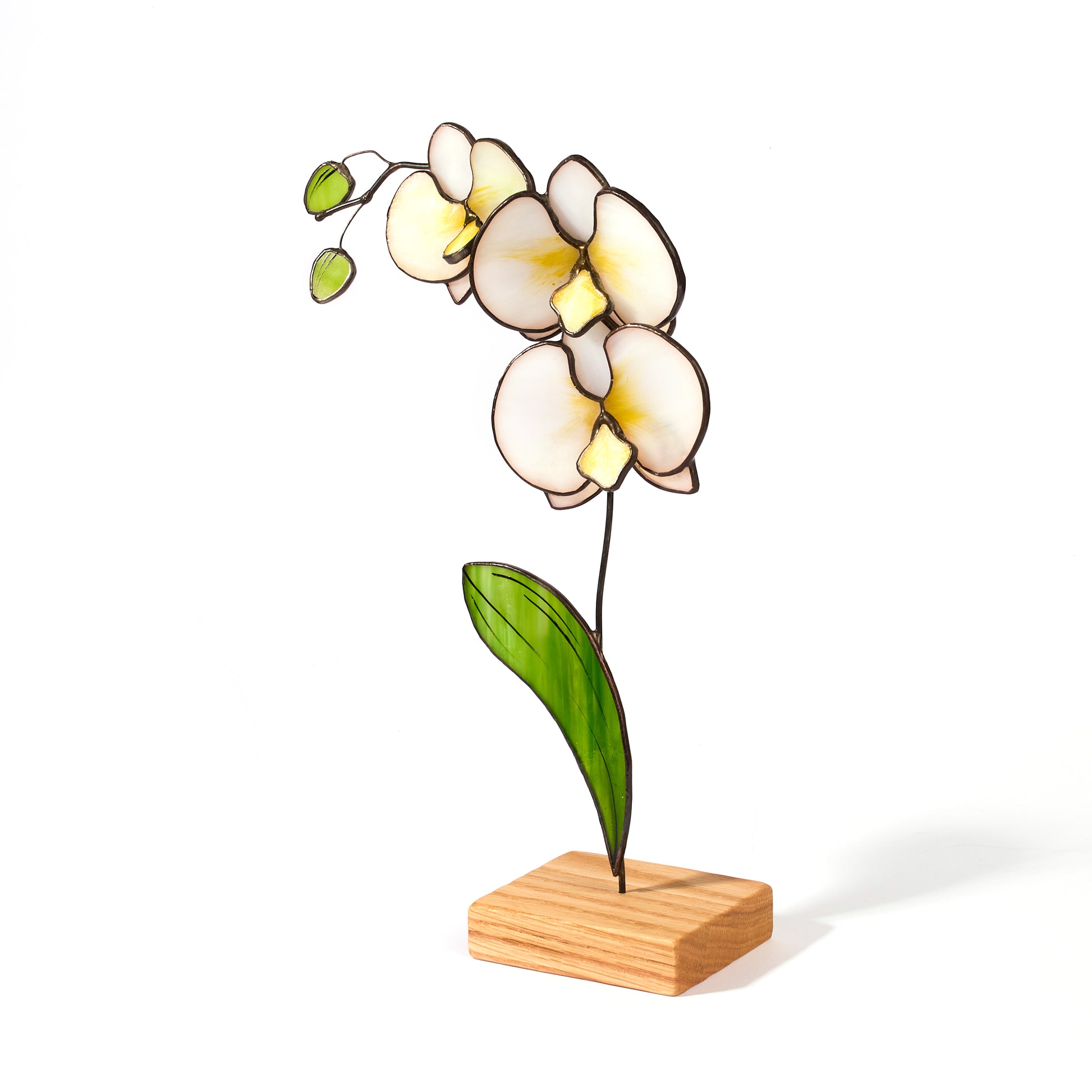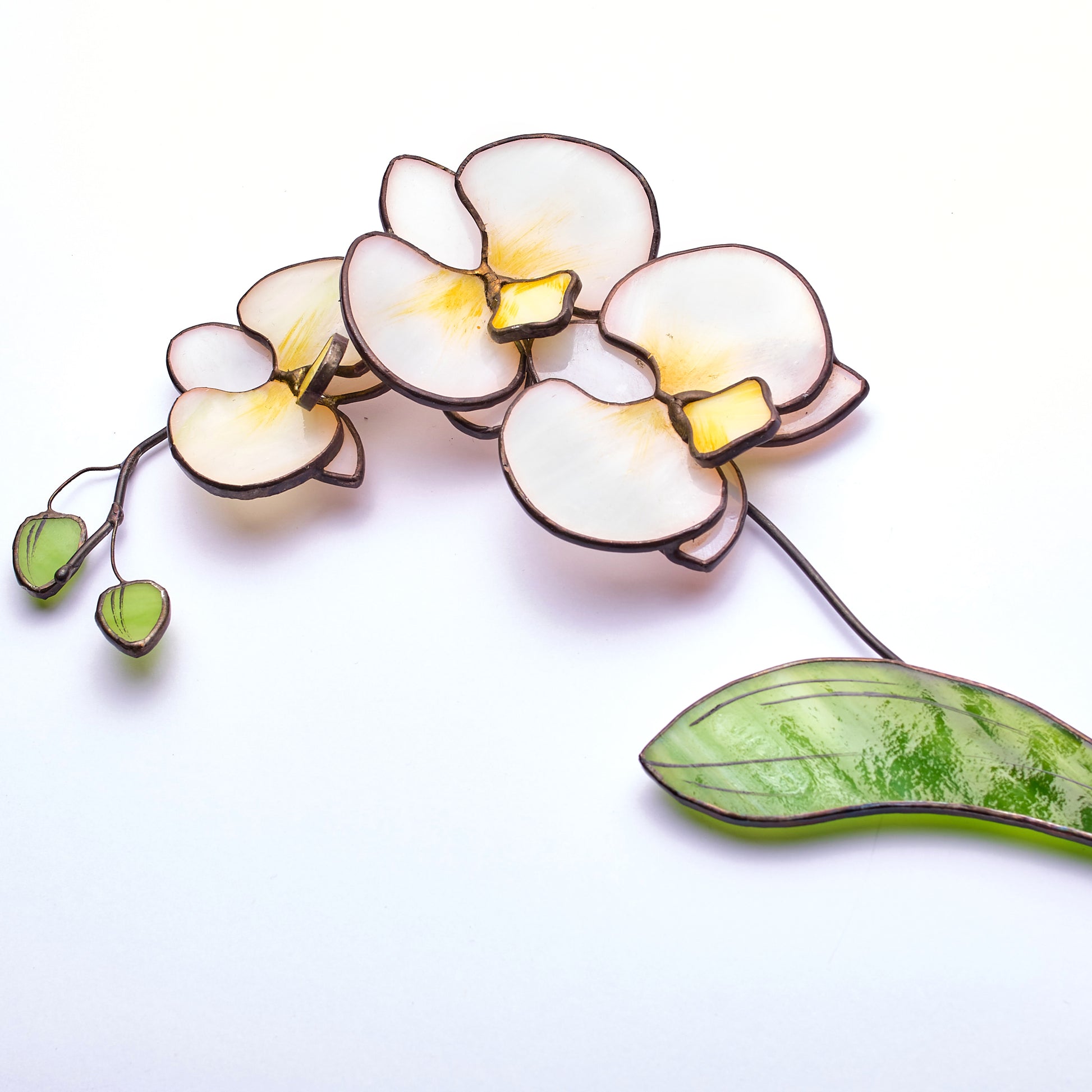 This delicate stained glass white orchid brings the timeless beauty of nature into your space. Crafted using the Tiffany technique, each petal is made from softly translucent white and creamy yellow glass, giving it a lifelike glow when caught in the light. A single vibrant green leaf complements the design, adding a touch of freshness and contrast.